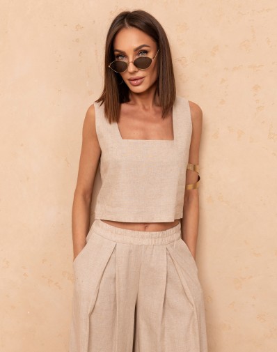 Lekki i stylowy komplet z lnem w składzie ,składający się z luźnego topu na grubych ramiączkach oraz spodni o szerokiej nogawce. Góra z modnym dekoltem karo pięknie podkreśla linię ramion i dodaje całości nowoczesnego charakteru. Spodnie na elastycznej gumie w pasie z praktycznymi kieszeniami oraz efektownymi zakładkami z przodu zapewniają wygodę i swobodę ruchów. Idealny wybór na ciepłe dni, łączący komfort z ponadczasową elegancją.