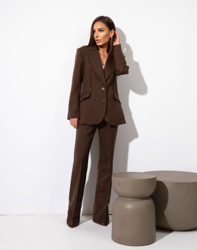 Stylowe spodnie wykonane z wysokiej jakości tkaniny, zapinane klasycznie na zamek i guzik. Fason z dopasowaną górą, który pięknie podkreśla sylwetkę, a nogawki rozszerzające się ku dołowi nadają całości nowoczesny, elegancki charakter. Idealne na co dzień, jak i na wieczorne wyjścia. Do kompletu dostępna jest również marynarka z tej samej tkaniny, tworząc spójną i modną stylizację.