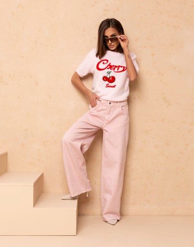 Spodnie jeansowe o fasonie z prostą,szerszą nogawką, wykonane z miękkiego dżinsu. To model z wyższym stanem, zapinany na guzik i suwak. Zarówno z przodu, jak i tyłu znajdują się funkcjonalne kieszenie. Wysoki stan pięknie podkreśla talię, a szerokie nogawki optycznie wydłużają sylwetkę i dodają nonszalanckiego luzu.Idealne do codziennych stylizacji – od sneakersów po szpilki.