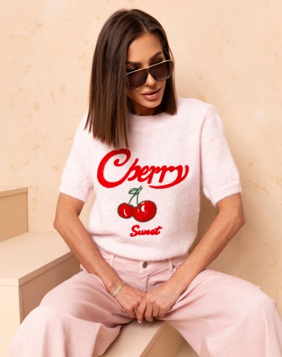 Sweterek z krótkim rękawem o klasycznym kroju w przepięknym cukierkowym kolorze. Uwagę przyciąga subtelna aplikacja wisienek na środku oraz napis , która dodaje całości uroku. Idealny do codziennych stylizacji oraz jako akcent w bardziej kobiecym looku.