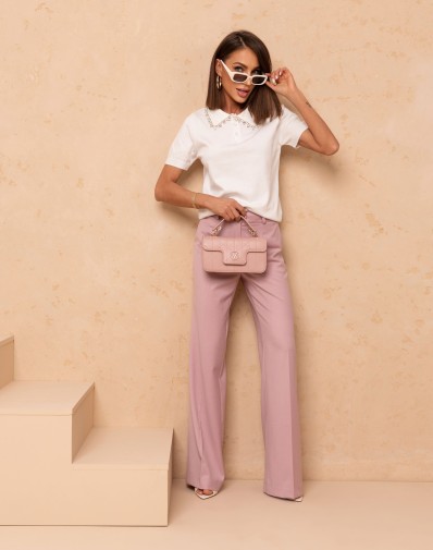 Komplet czekoladowy o luźnym kroju z wysokiej jakości tkaniny jakości premium. Koszula z kołnierzykiem, Zapinana na guziki. Obniżona linia ramion i wydłużone, efektowne mankiety. Spodnie z wysokim stanem. Zakładki z przodu. tył gładki .Zamek kryty z boku, w pasie szlufki. Komplet wyróżnia dopinany kwiat , który dodaje romantycznego akcentu. Wprowadza subtelny, kobiecy element do stylizacji.