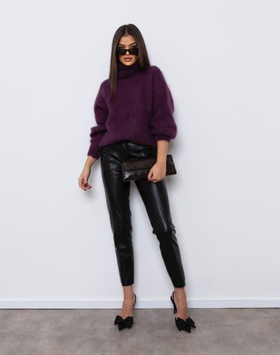 Miękki, oversize'owy sweter w odcieniu przepięknego fioletu to idealny wybór na chłodniejsze dni. Wykonany z grubego, przyjemnego w dotyku kid moheru , zapewnia komfort i swobodę ruchów. Posiada wysoki golf, który dodaje ciepła i stylu. Luźny krój i delikatnie opuszczone ramiona nadają mu modny, casualowy wygląd. Świetnie komponuje się zarówno z jeansami, jak i eleganckimi spodniami.
