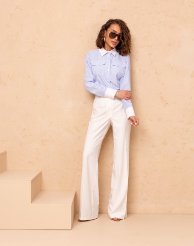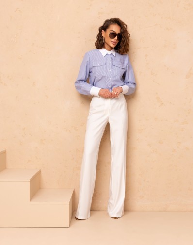 Stylowa koszula w niebiesko-białe paski. Wykonana z miękkiego, przyjemnego w dotyku materiału, który zapewnia wygodę przez cały dzień. Model zapinany na guziki z klasycznym śmietankowym kołnierzykiem i mankietami przy rękawach.Dwie duże kieszonki na przodzie.Zakończona delikatnym zaokrągleniem.Doskonale sprawdzi się w casualowych stylizacjach – noś ją z jeansami,eleganckimi spodniami lub do spódnic.