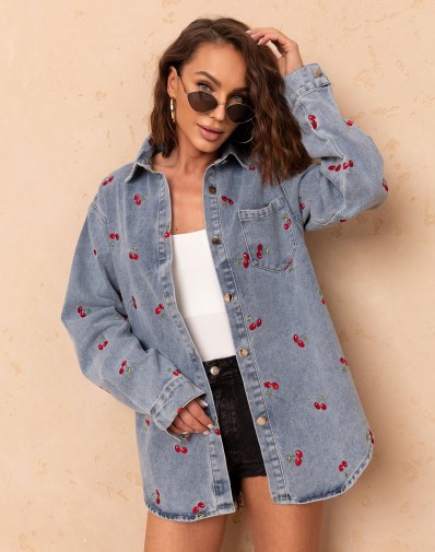 Stylowa bawełniana koszula z jeansowej tkaniny o klasycznym kroju z motywem wyszytych wisienek . Wykonana z miękkiego, przyjemnego w dotyku materiału, który zapewnia wygodę przez cały dzień. Model zapinany na guziki z klasycznym kołnierzykiem i mankietami przy rękawach zapinanych na guziki.Z przodu dwie kieszonki z patkami.Doskonale sprawdzi się w casualowych stylizacjach – noś ją z jeansami, topem lub jako lekką narzutkę.