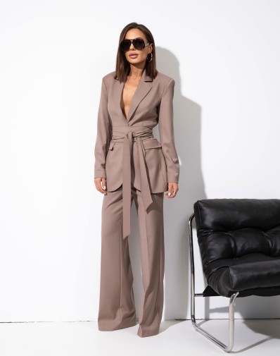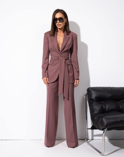 Komplet czekoladowy o luźnym kroju z wysokiej jakości tkaniny jakości premium. Koszula z kołnierzykiem, Zapinana na guziki. Obniżona linia ramion i wydłużone, efektowne mankiety. Spodnie z wysokim stanem. Zakładki z przodu. tył gładki .Zamek kryty z boku, w pasie szlufki. Komplet wyróżnia dopinany kwiat , który dodaje romantycznego akcentu. Wprowadza subtelny, kobiecy element do stylizacji.