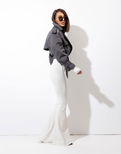 Trencz w eleganckim, krótkim kroju wykonana z miękkiego materiału. Zapinany na guzik. Szeroki kołnierz, wydłużone klapy oraz pasek podkreślają dopracowane detale i stylowy, premium look.Ponadczasowy model, który pięknie układa się na sylwetce i doskonale uzupełni zarówno codzienne, jak i bardziej eleganckie stylizacje.