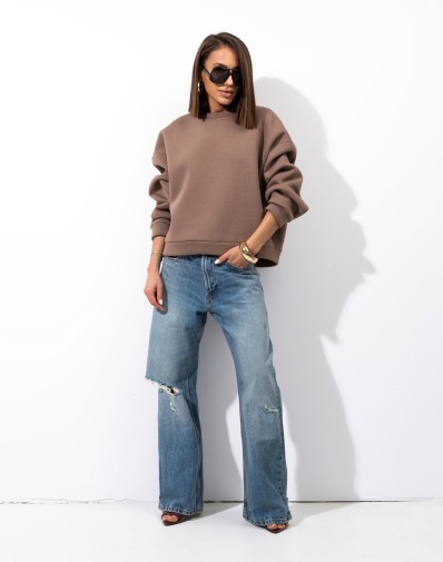 Oversizowa bluza o klasycznym kroju z obniżoną linią ramion. Jej krój zapewnia swobodę i modny, casualowy look. Wykonana z miękkiej bawełny od spodu na misiu, który zapewnia przyjemne ciepło w chłodniejsze dni. Wyjątkowa, komfortowa w noszeniu.