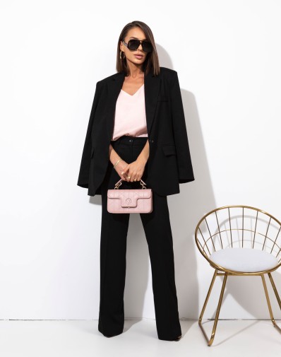 Spodnie z rozszerzaną nogawką. W pasie szlufki. Przód zapinany na klasyczne zapięcie. Z przodu wsuwane kieszenie. Z tyłu patki. Skompletujesz je z naszymi marynarkami KARMEN.