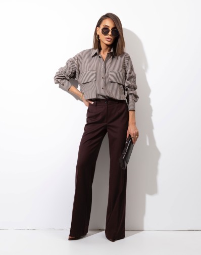 Komplet z delikatne,zwiewnej tkaniny.Koszula o kroju "kimono" dzięki czemu model jest luźny i swobodny. Subtelny kołnierz,zapinana po długości na guziki.Na przodzie na ramionach delikatne zakładki - subtelnie podkreślają górną część sylwetki, nadając jej wyrafinowanego charakteru.Rękawy zakończone niewielkim mankietem zapinanym na guzik.Szerokie, luźne spodnie. Model z wygodną gumką i regulacją na sznurek w pasie zapewnia idealne dopasowanie oraz komfort przez cały dzień. Praktyczne kieszenie po bokach dodają funkcjonalności