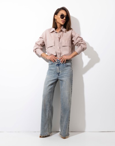 Jeansy z szeroką nogawką uszyte z mięsistego, wysokiej jakości denimu. Model z wysokim stanem i asymetrycznym zapięciem na dwa guziki oraz suwak pięknie podkreśla talię i optycznie wydłuża sylwetkę. Sprany odcień jeansu oraz postrzępione wykończenie nogawek nadają im wyrazistego, miejskiego charakteru. Idealne do codziennych stylizacji – świetnie wyglądają zarówno ze sneakersami, jak i z eleganckimi szpilkami.