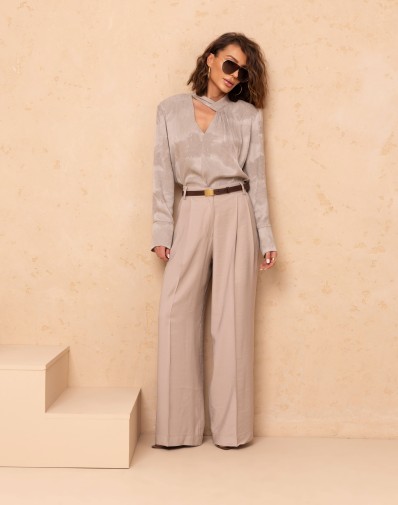 Eleganckie spodnie o szerokim kroju, które łączą komfort z nowoczesnym stylem. Model z wysokim stanem i efektownymi zakładkami pięknie wydłuża sylwetkę. Zapinane asymetrycznie na guziki (bez zamka), co nadaje im unikalnego charakteru. Luźne nogawki zapewniają swobodę ruchu i świetnie sprawdzą się zarówno w stylizacjach casualowych, jak i bardziej eleganckich.