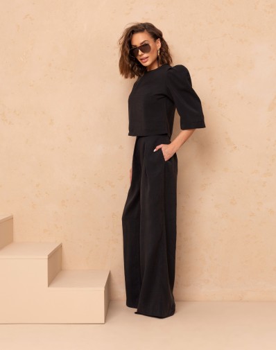 Eleganckie spodnie w klasycznej czerni , które łączą styl i wygodę. Wysoki stan pięknie podkreśla talię, a luźniejszy krój nogawek zapewnia swobodę ruchów i nowoczesny look. Zapinane na zamek i guzik, z praktycznymi zakładkami z przodu, świetnie sprawdzą się zarówno w eleganckich, jak i codziennych stylizacjach.