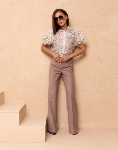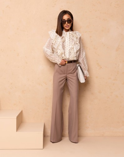 Koszula o kobiecym i eleganckim kroju zapinana na guziki. Model wyróżnia się efektownymi bufiastymi rękawami oraz falbankami po długości z dwóch stron na przodzie ,dodaje to całości szyku i subtelnej elegancji. Lekki, delikatnie transparentny materiał w groszki.Rękawy oraz mała dopinana róża nadają koszuli wyjątkowego charakteru. Idealna zarówno do codziennych stylizacji z jeansami, jak i bardziej eleganckich zestawów.