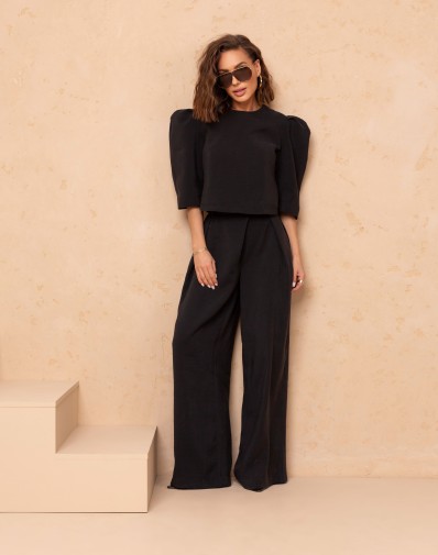 Stylowe spodnie, które łączą elegancję z wygodą. Szerokie spodnie zakończone gumką z elastyczną talią, które pięknie układają się na sylwetce. Lekki, zwiewny materiał zapewnia komfort noszenia przez cały dzień, a swobodny fason nadaje całości nowoczesnego charakteru. Idealne zarówno na co dzień, jak i na bardziej eleganckie wyjścia.