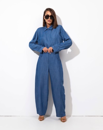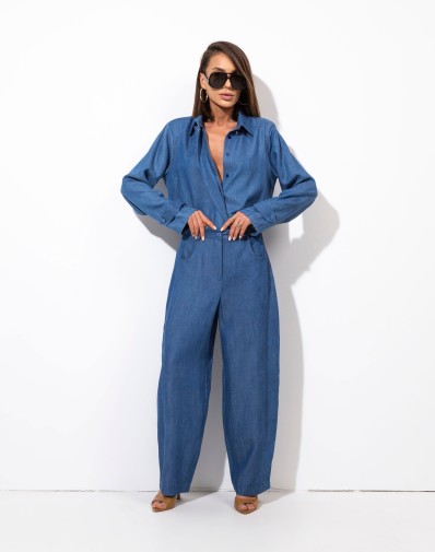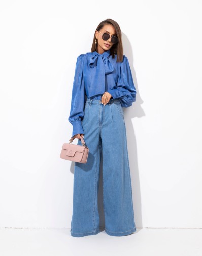 Koszula z kołnierzykiem wykonana z tkaniny jeansowej . Zapinana na guziki. Obniżona linia ramion i wydłużone, efektowne mankiety. W komplecie szarfa do wiązania pod szyją. Tkanina wiskozowa z satynowym połyskiem. Koszula pasuje do wielu typów sylwetki. Możesz ją nosić luźno opuszczoną, zawiązaną na węzeł lub wsuniętą do spodni.