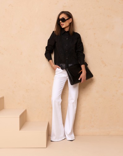 Klasyczna biała koszula damska zapinana po długości na guziki to ponadczasowa baza do wielu stylizacji. Model wyszyty koronką z klasycznym kołnierzem, długie rękawy zakończone mankietami oraz koronkowe wykończenie dołu koszuli dodaje całości subtelnego charakteru. Idealna zarówno do eleganckich, jak i codziennych zestawów.