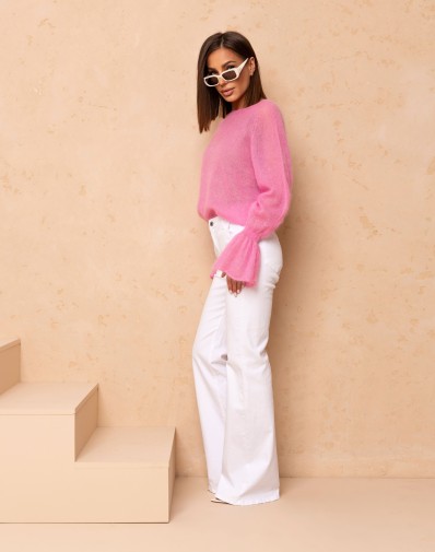 Jeansy z szeroką nogawką uszyte z mięsistego, wysokiej jakości denimu. Model z wysokim stanem i asymetrycznym zapięciem na dwa guziki oraz suwak pięknie podkreśla talię i optycznie wydłuża sylwetkę. Sprany odcień jeansu oraz postrzępione wykończenie nogawek nadają im wyrazistego, miejskiego charakteru. Idealne do codziennych stylizacji – świetnie wyglądają zarówno ze sneakersami, jak i z eleganckimi szpilkami.