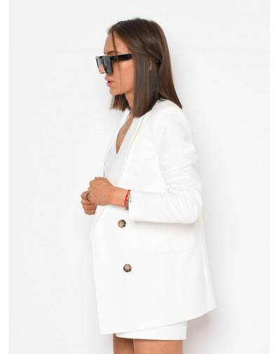 Marynarka wykonana z wysokiej jakości materiału w kolorze śmietankowym. Zapinana na dwa rzędy guzików. Rękaw długi. Na podszewce.