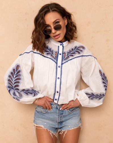Stylowa koszula o luźnym kroju, wyróżniająca się efektownym haftem i dekoracyjnymi przeszyciami. Klasyczny fason został przełamany ozdobnym wykończeniem przy dekolcie oraz wzdłuż zapięcia, co nadaje całości wyjątkowego charakteru. Dół zakończony gumką tworzy modny efekt „bombki”, dzięki czemu koszula świetnie układa się na sylwetce. Lekka i przyjemna w noszeniu, idealna zarówno na co dzień, jak i do bardziej eleganckich stylizacji.