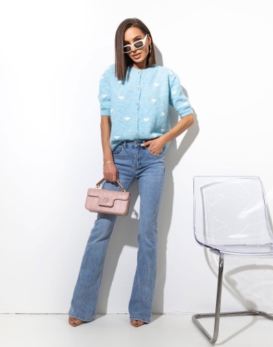 Sweterek z krótkim rękawem o klasycznym kroju, zakończony prążkiem na dole i na rękawach. Uwagę przyciąga subtelna aplikacja białych serduszek,które dodają dziewczęcego charakteru.Zapinany po całości na guziki. Idealny do codziennych stylizacji,na chłodniejsze dni.