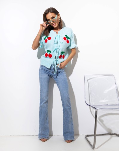 Sweterek damski o klasycznym kroju, zawiązywany z przodu na trzy urocze kokardki. Model z krótkim rękawem zakończonym delikatną falbanką, która dodaje mu lekkości i dziewczęcego charakteru.Na przodzie znajdują się wyszywane wisienki, które przyciągają uwagę i nadają całości oryginalnego, subtelnie romantycznego akcentu.Wygodny fason sprawdzi się zarówno w codziennych stylizacjach, jak i w bardziej kobiecych zestawach. Idealny do spódnic, szortów i jeansów.