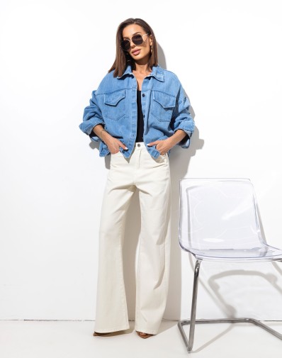 Spodnie jeansowe o fasonie z szeroką nogawką, wykonane z elastycznego dżinsu, na bokach lampas . To model z wysokim stanem, zapinany na guzik i suwak. Zarówno z przodu, jak i tyłu znajdują się funkcjonalne kieszenie. Wysoki stan pięknie podkreśla talię, a szerokie nogawki optycznie wydłużają sylwetkę i dodają nonszalanckiego luzu.Idealne do codziennych stylizacji – od sneakersów po szpilki.