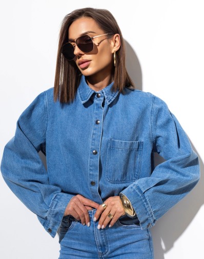Krótka jeansowa koszula o klasycznym, ponadczasowym kroju. Model zapinany na praktyczne zatrzaski, które nadają całości nowoczesnego charakteru i zapewniają wygodę użytkowania. Koszula posiada klasyczny kołnierz,na przodzie jedną kieszeń oraz długie rękawy zakończone mankietem zapinanym na jeden zatrzask.Wykonana w 100% z bawełny, gwarantuje komfort noszenia i naturalną przewiewność. Idealna do stylizacji z jeansami, spódnicą lub jako lekka narzutka na top.