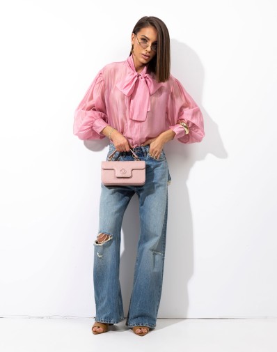 Elegancka koszula w odcieniu pudrowego różu, wykonana z lekkiego, subtelnie połyskującego materiału, który pięknie układa się na sylwetce. Model wyróżnia się efektowną wiązaną kokardą przy szyi oraz bufiastymi rękawami zakończonymi mankietami. Idealna zarówno do stylizacji codziennych z jeansami, jak i bardziej eleganckich zestawów.