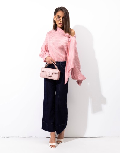 Elegancka koszula w odcieniu pudrowego różu w paski, która łączy klasykę z nowoczesnym stylem. Asymetryczny dekolt z wiązaniem oraz lekko opadające ramię nadają jej wyjątkowego, kobiecego charakteru. Luźniejszy fason i miękki materiał zapewniają komfort noszenia, a jednocześnie świetnie prezentują się zarówno w stylizacjach casualowych, jak i bardziej eleganckich.