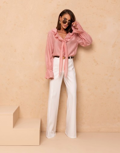 Stylowa koszula o kobiecym i eleganckim kroju zapinana na guziki. Model wyróżnia się efektownym wiązaniem pod szyją oraz falbanką po długości,która dodaje całości szyku i subtelnej elegancji. Lekki, delikatnie połyskujący materiał w białe paski pięknie układa się na sylwetce, a bufiaste rękawy zakończone szerszymi mankietami nadają koszuli wyjątkowego charakteru. Idealna zarówno do codziennych stylizacji z jeansami, jak i bardziej eleganckich zestawów.