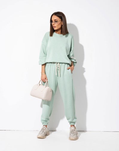 Komplet dresowy w pistacjowym kolorze, wykonany z miękkiego i przyjemnego w dotyku materiału. Spodnie z elastyczną gumką i regulacją na sznurek w pasie, posiadają praktyczne kieszenie po bokach oraz ściągacze na dole nogawek. Luźna bluz z tyłu dłuższa z ozdobną naszywką na rękawie zapewnia komfort i swobodny, casualowy look.