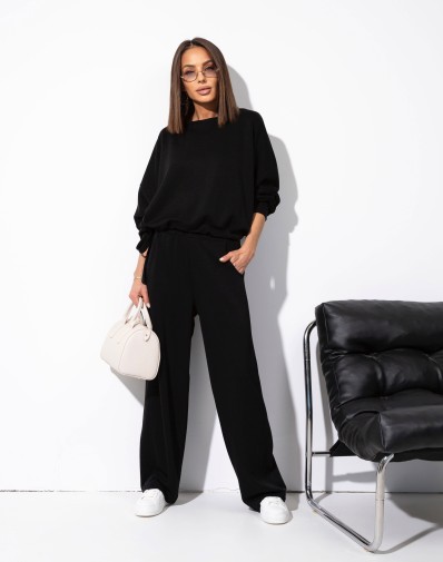 Komplet wykonany z dzianiny dresowej. Spódnica dopasowana. W pasie guma. Góra w formie szerokiej bluzy. Wykończona ściągaczami.