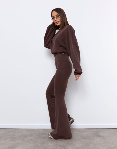 Stylowy i ultrakobiecy komplet, który łączy wygodę z modnym krojem. Bluza o luźnym fasonie z obniżoną linią ramion oraz gumą w pasie idealnie komponuje się z dopasowanymi spodniami z szerokimi nogawkami typu flare. Elastyczny pas podkreśla talię, a miękka, przyjemna w dotyku dzianina zapewnia komfort przez cały dzień. Czekoladowy odcień dodaje elegancji i świetnie sprawdzi się zarówno w casualowych, jak i bardziej stylowych stylizacjach