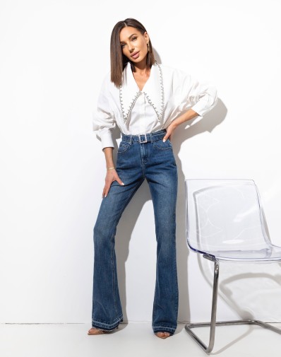 Wiskozowy komplet w ciemnym dżinsie.Klasyczna  koszula damska zapinana na kryte guziki to ponadczasowa baza do wielu stylizacji. Model z klasycznym kołnierzem, długim rękawem zakończonym dłuższym mankietem oraz ozdobnymi patkami z przodu, które nadają całości subtelnego charakteru.Spodnie z rozszerzaną nogawką. W pasie szlufki. Przód zapinany na klasyczne zapięcie. Z przodu wsuwane kieszenie. Z tyłu patki.