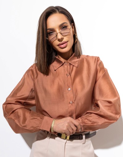 Klasyczna koszula o luźnym kroju, zapinana na guziki, z eleganckim kołnierzykiem. Wykonana z delikatnego, lekko zwiewnego materiału, który pięknie układa się na sylwetce.Tył dłuższy. Delikatnie obniżona linia ramion , rękawy zakończone niewielkim mankietem.Idealna do eleganckich stylizacji.Do spódnic,spodni.