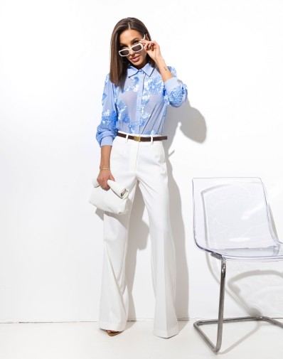 Elegancka koszula transparentna. Wykonana z lekkiego,elastycznego materiału. Model o prostym,klasycznym kroju z kołnierzykiem i zapięciem na guziki.Rękawy zakończone mankietami. Przezroczysta struktura nadaje koszuli kobiecego charakteru i wyjątkowego wyglądu , naszyte kwiaty dodają delikatności.. Idealna na wieczorne wyjścia, spotkania czy eleganckie stylizacje z nutą nowoczesności.