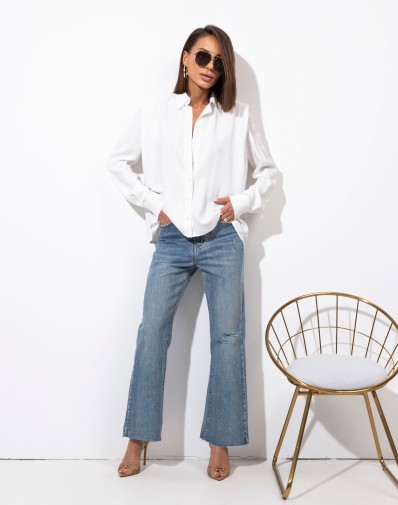 Klasyczna biała koszula damska zapinana na kryte guziki to ponadczasowa baza do wielu stylizacji. Model z klasycznym kołnierzem, długim rękawem zakończonym mankietami oraz ozdobnymi patkami z przodu, które nadają całości subtelnego charakteru. Idealna zarówno do eleganckich, jak i codziennych zestawów.