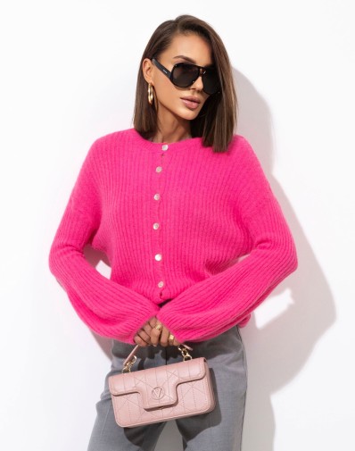Sweter zapinany na guziki na całej długości, wykonany z miękkiej dzianiny o delikatnej, prążkowanej strukturze. Model z długim rękawem o szerokim, lekko bufias­tym kroju, który nadaje całości elegancki i kobiecy charakter. Idealny do codziennych i bardziej stylowych zestawień.