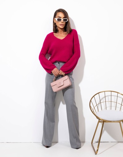 Sweter z dekoltem V , wykonany z miękkiej dzianiny o delikatnej, prążkowanej strukturze. Model z długim rękawem o szerokim, lekko bufias­tym kroju, który nadaje całości elegancki i kobiecy charakter. Idealny do codziennych i bardziej stylowych zestawień.