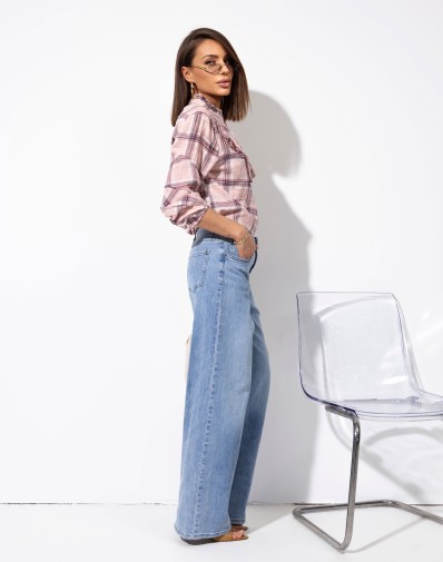Spodnie jeansowe o fasonie z szeroką nogawką, wykonane z elastycznego materiału. To model z wysokim stanem, zapinany na guzik i suwak. Zarówno z przodu, jak i tyłu znajdują się funkcjonalne kieszenie. Delikatne zakładki z przodu.Wysoki stan pięknie podkreśla talię, a szerokie nogawki optycznie wydłużają sylwetkę i dodają nonszalanckiego luzu.Idealne do codziennych stylizacji – od sneakersów po szpilki.