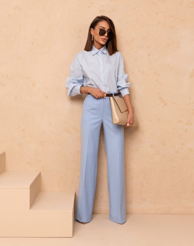 Elegancka błękitna koszula o luźnym, nowoczesnym kroju, która łączy klasykę z subtelnym blaskiem. Model wyróżniają ozdobne aplikacje ze srebrnymi kryształkami rozmieszczone na całej powierzchni z przodu oraz na rękawach , dodające stylizacji wyjątkowego charakteru. Wykonana z przyjemnej, lekkiej tkaniny, zapewnia komfort noszenia przez cały dzień. Idealna zarówno do eleganckich stylizacji z marynarką, jak i do casualowego looku z jeansami.