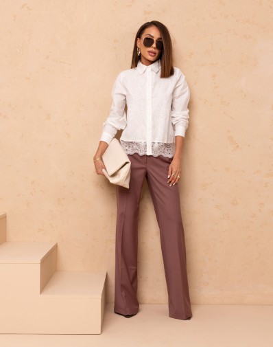 Klasyczna biała koszula damska zapinana po długości na guziki to ponadczasowa baza do wielu stylizacji. Model wyszyty koronką z klasycznym kołnierzem, długie rękawy zakończone mankietami oraz koronkowe wykończenie dołu koszuli dodaje całości subtelnego charakteru. Idealna zarówno do eleganckich, jak i codziennych zestawów.