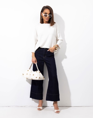 Spodnie jeansowe o fasonie z szeroką nogawką, wykonane z elastycznego dżinsu. To model z wysokim stanem, zapinany na guzik i suwak. Zarówno z przodu, jak i tyłu znajdują się funkcjonalne kieszenie. Wysoki stan pięknie podkreśla talię, a szerokie nogawki optycznie wydłużają sylwetkę i dodają nonszalanckiego luzu.Idealne do codziennych stylizacji – od sneakersów po szpilki.