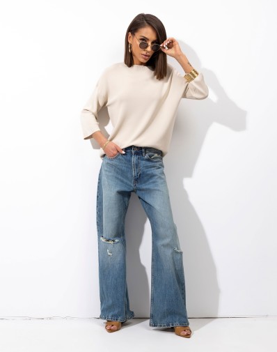 Spodnie ecru ,jeansowe o fasonie z prostą nogawką, wykonane ze sztywniejszego dżinsu. To model z niższym stanem, zapinany na guzik i suwak. Zarówno z przodu, jak i tyłu znajdują się funkcjonalne kieszenie. Wysoki stan pięknie podkreśla talię, a szerokie nogawki optycznie wydłużają sylwetkę i dodają nonszalanckiego luzu.Idealne do codziennych stylizacji – od sneakersów po szpilki.