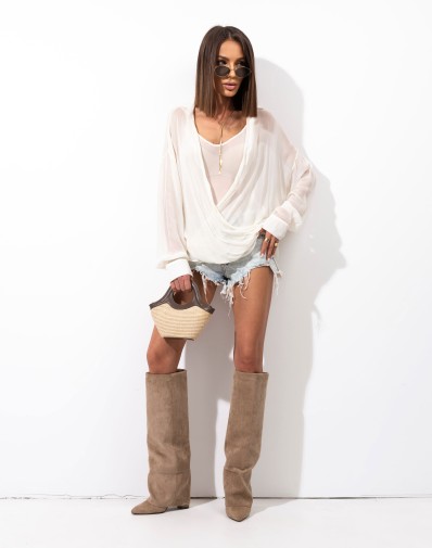Lekka i stylowa bluzka 2w1, która łączy delikatną, zwiewną koszulę z topem pod spodem. Kopertowy fason pięknie układa się na sylwetce, a półtransparentny materiał dodaje całości subtelnej elegancji. Luźne rękawy i falowane wykończenie nadają jej kobiecego, modnego charakteru. Idealna zarówno do codziennych stylizacji z jeansami, jak i bardziej eleganckich zestawów.