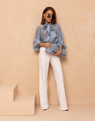 Elegancka błękitna koszula o luźnym, nowoczesnym kroju, która łączy klasykę z subtelnym blaskiem. Model wyróżniają ozdobne aplikacje ze srebrnymi kryształkami rozmieszczone na całej powierzchni z przodu oraz na rękawach , dodające stylizacji wyjątkowego charakteru. Wykonana z przyjemnej, lekkiej tkaniny, zapewnia komfort noszenia przez cały dzień. Idealna zarówno do eleganckich stylizacji z marynarką, jak i do casualowego looku z jeansami.