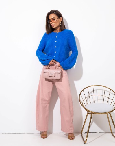 Sweter zapinany na guziki na całej długości, wykonany z miękkiej dzianiny o delikatnej, prążkowanej strukturze. Model z długim rękawem o szerokim, lekko bufiastym kroju, który nadaje całości elegancki i kobiecy charakter. Idealny do codziennych i bardziej stylowych zestawień.
