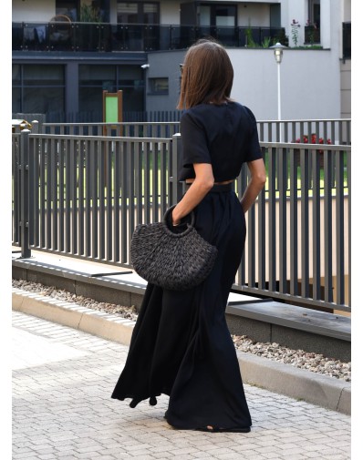 Komplet dwuczęściowy wykonany z wiskozowej tkaniny. Góra w formie bluzki. Dół, spódnica maxi na gumce i z kieszeniami. W komplecie bardzo długa szarfa do owinięcia się na dwa razy. Idealny letni zestaw w pięknym kolorze.