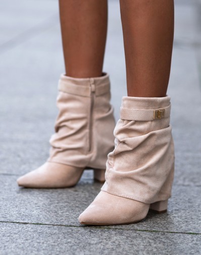 Beżowe botki zamszowe na słupku to połączenie wygody, kobiecości oraz klasyki. Wykonane z miękkiego zamszu, wyróżniają się efektownymi marszczeniami, które nadają całości wyjątkowego charakteru .Stabilny obcas typu słupek o wysokości 9,5 cm wysmukla sylwetkę, a jednocześnie pozostaje komfortowy nawet przy dłuższym noszeniu. Botki zapinane są na praktyczny zamek, co ułatwia ich zakładanie.Świetnie sprawdzą się w jesiennych i zimowych stylizacjach – idealne zarówno do jeansów, jak i sukienek czy spódnic, dodając im niepowtarzalnego klimatu.
