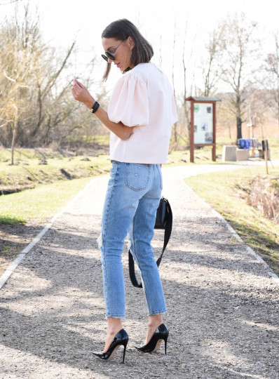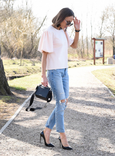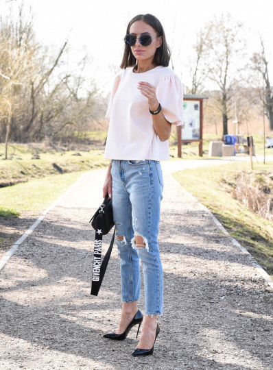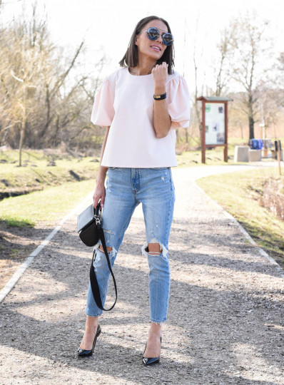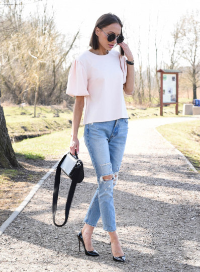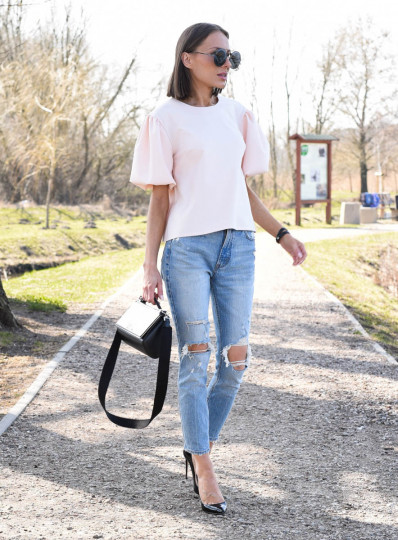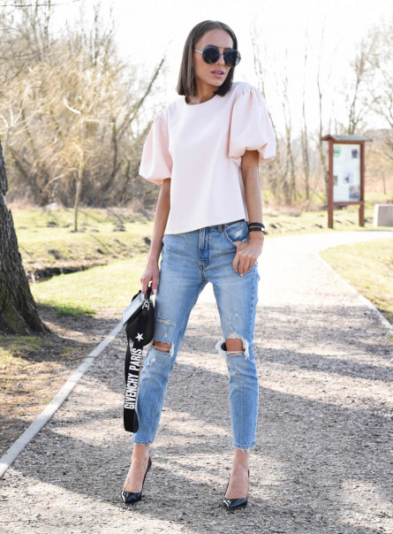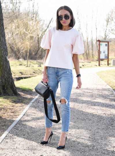 Bluzka wykonana z delikatnie elastycznej dzianinyRękawy bufiasteRamiona obniżoneSkład: 92% wiskoza 8% elastanModelka mierzy 166cm i prezentuje rozmiar XS.
